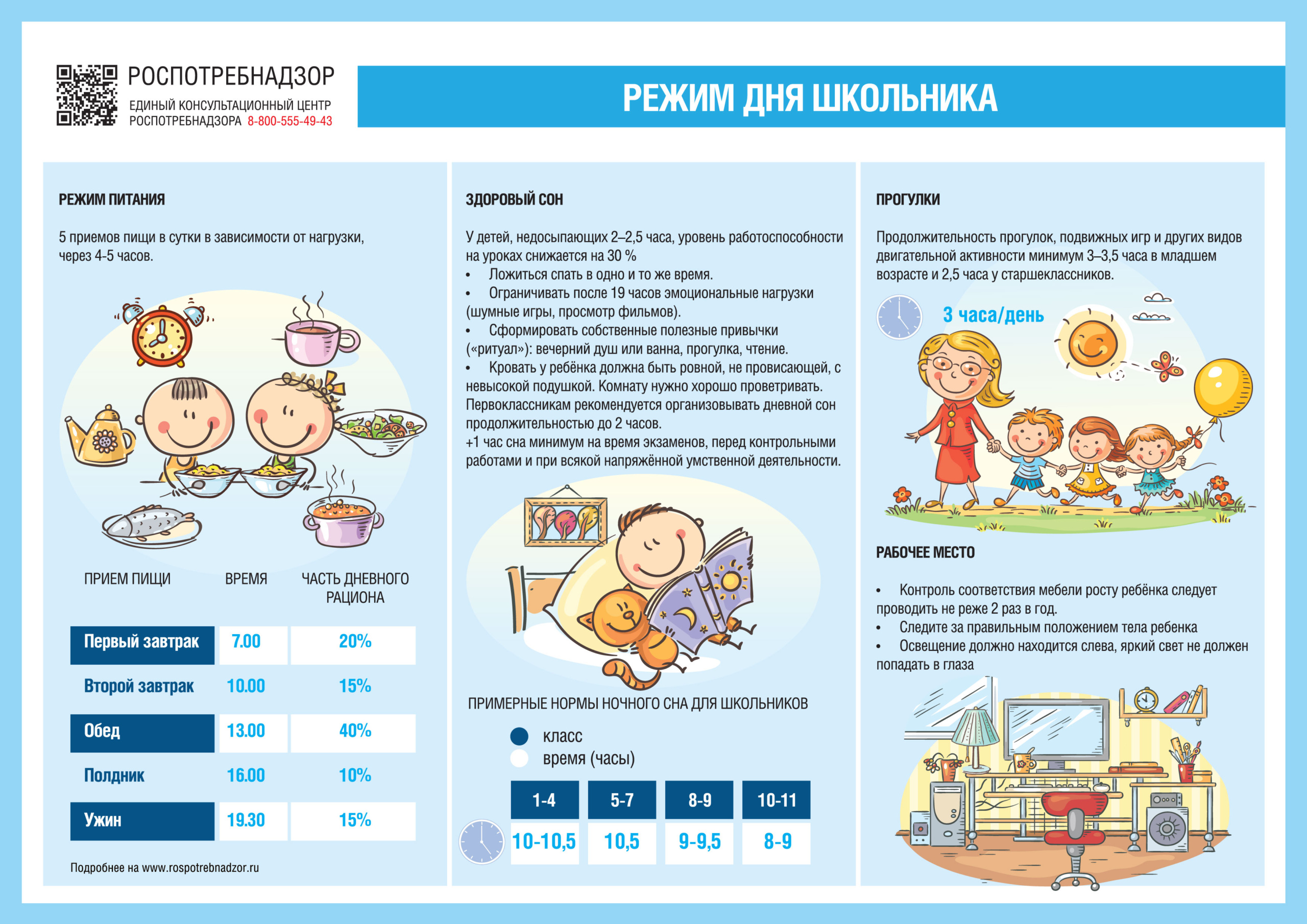 Соблюдение режима работы и отдыха является неотъемлемой частью личной гигиены, и положительно сказывается на развитии ребенка и успеваемости в школе в дальнейшем. Ребенку необходимо спать, гулять, делать уроки, принимать пищу в одно и то же время. Детский организм быстро привыкает к режиму и ему легче справляться с любой нагрузкой.