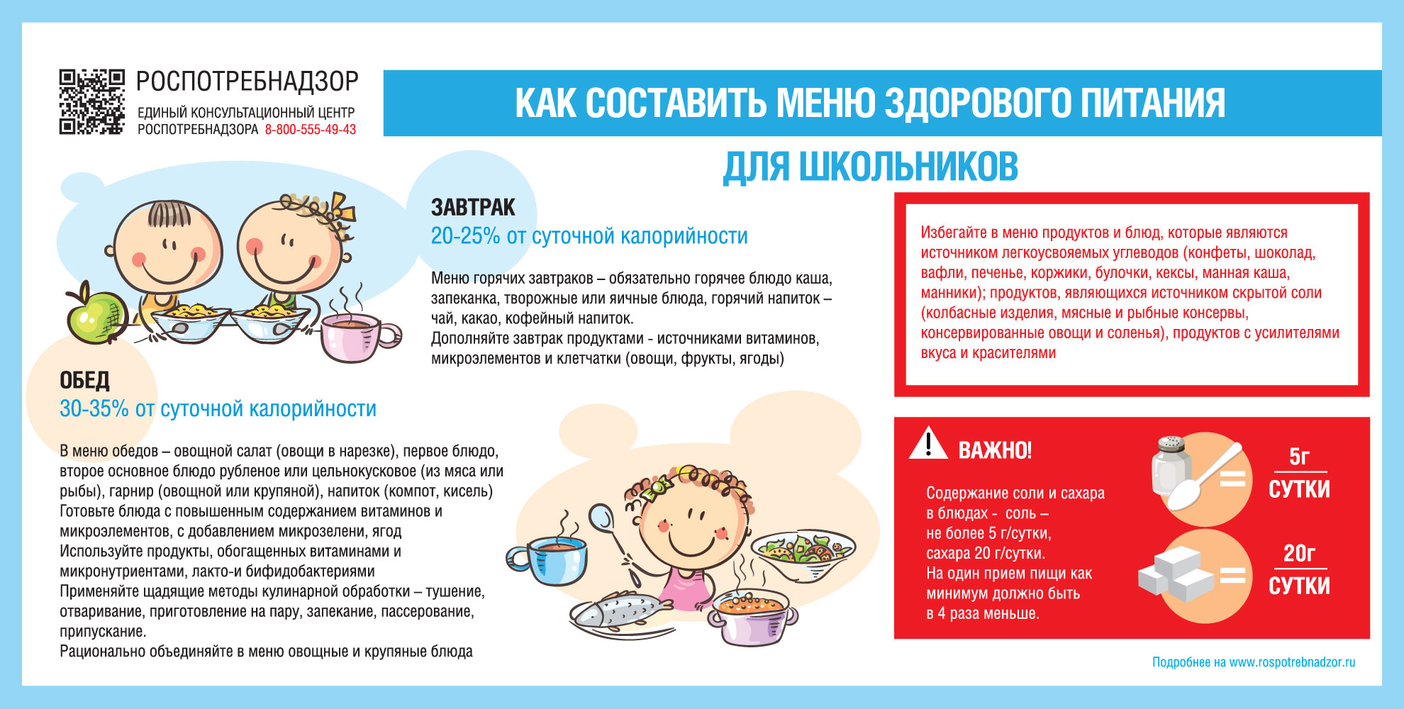 Для растущего организма необходимы витамины, минеральные вещества, поэтому питание должно быть разнообразным и регулярным. В рационе должны быть молочные продукты, каши, овощи и фрукты, ягоды, орехи. Рациональное питание — правильное сочетание белков, жиров, углеводов, витаминов и микроэлементов. Еда должна быть свежеприготовленная, сбалансированная, а также обладать приятным запахом и видом. Есть следует не торопясь, тщательно пережевывая пищу, а также во время еды ребенок не должен отвлекаться и разговаривать. Не следует использовать сырую воду из-под крана, нужно пользоваться кипячёной водой, овощи и фрукты перед употреблением необходимо тщательно мыть, даже обдавать кипятком. Ребенок должен знать, какие продукты полезны, а какие вредны для здоровья.