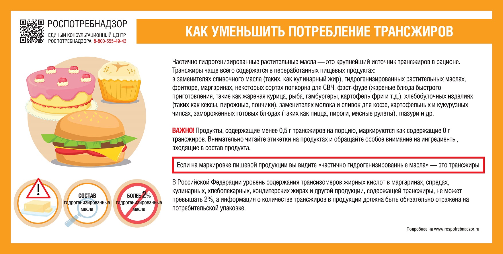 В Российской Федерации уровень содержания трансизомеров жирных кислот в маргаринах, спредах, кулинарных, хлебопекарных, кондитерских жирах и другой продукции, содержащей трансжиры, не может превышать 2%, а информация о количестве трансжиров в продукции должна быть обязательно отражена на потребительской упаковке.
